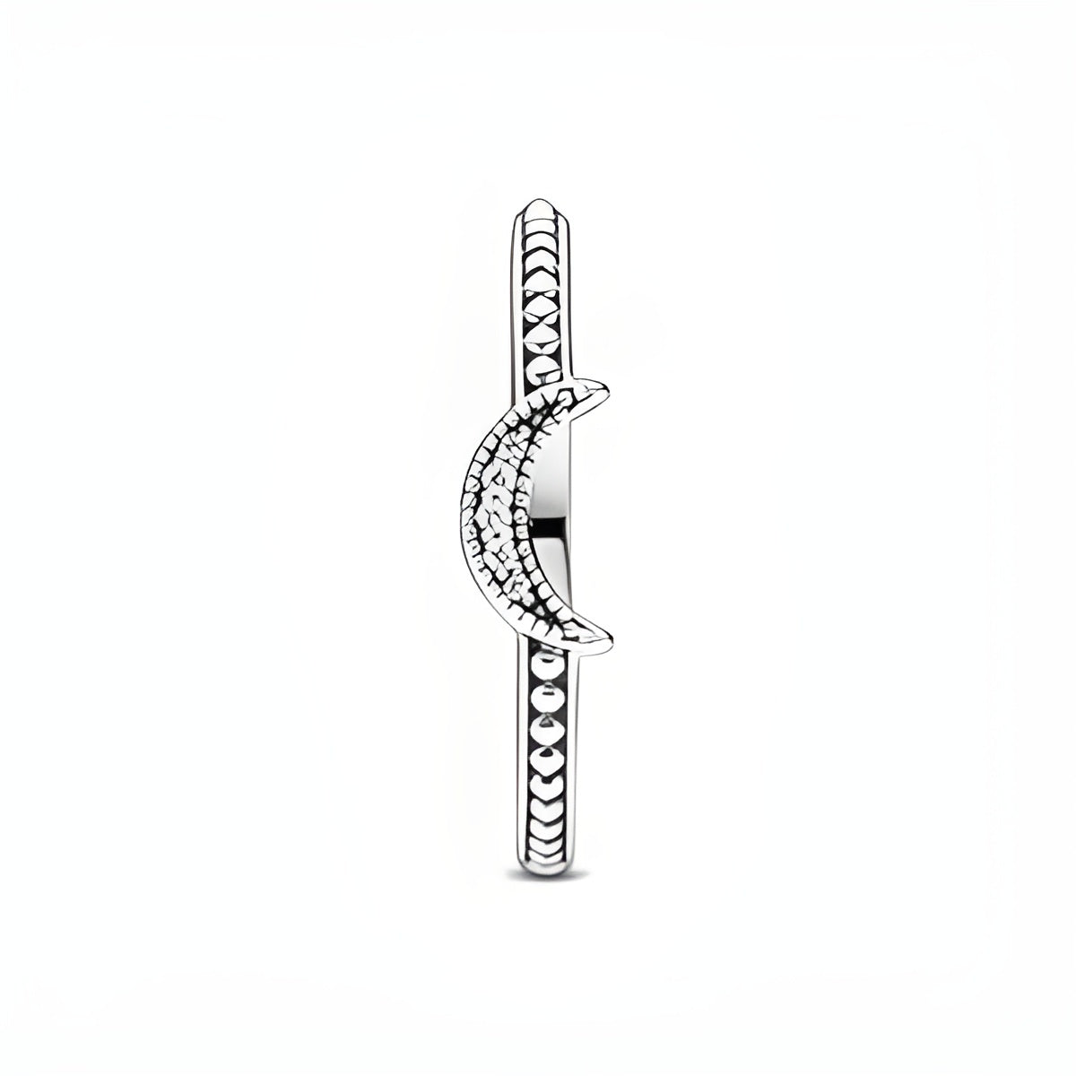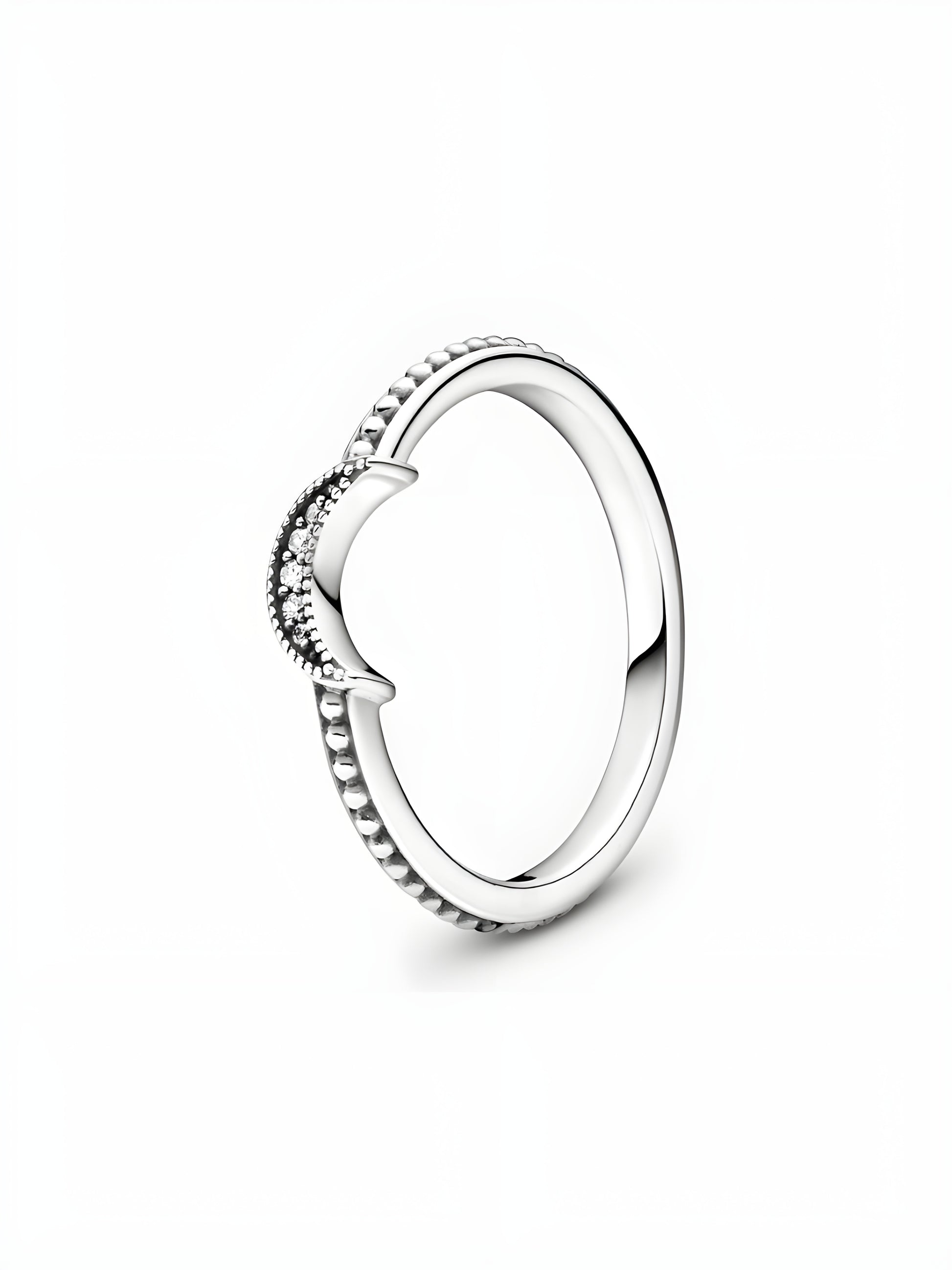 Channel celestial power with the Crescent Moon Beaded Ring. Hand-finished in sterling silver, this piece features a horizontal crescent moon set at an angle on the ring shank. The inside of the moon includes sparkling clear cubic zirconia surrounded by a beaded edging. Large beading features all the way around the ring shank for added detailing. Wear this silver crescent moon ring as a symbol of spirituality, mysticism and powerful feminine energy.