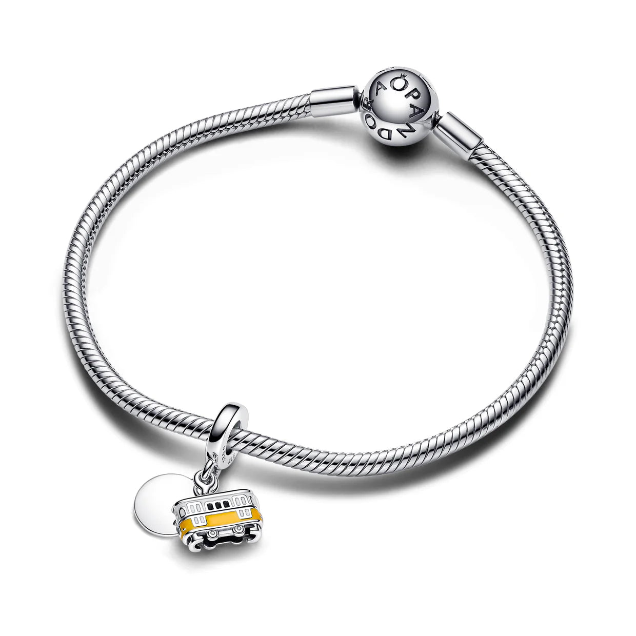 The "Engravable Lisbon Tram Sterling Silver Double Dangle" is Adetailed charm featuring a sterling silver tram with yellow enamel, clear cubic zirconia, red accents, and a dangling tag that can be engraved for personalization, celebrating travel and Lisbon.