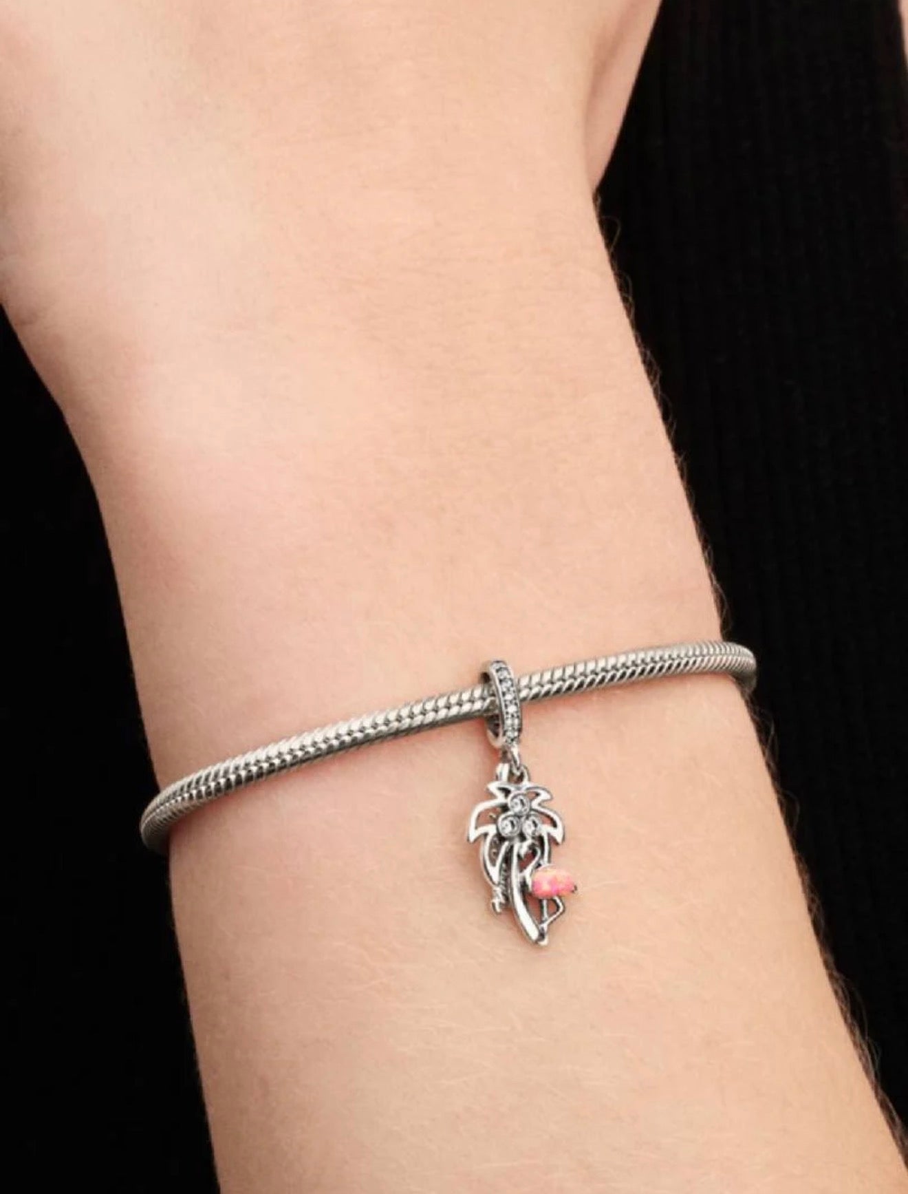 Celebrate the magic of Miami with a palm tree, flamingo, and handwritten 'Miami' script, all set with stones and enamel details.