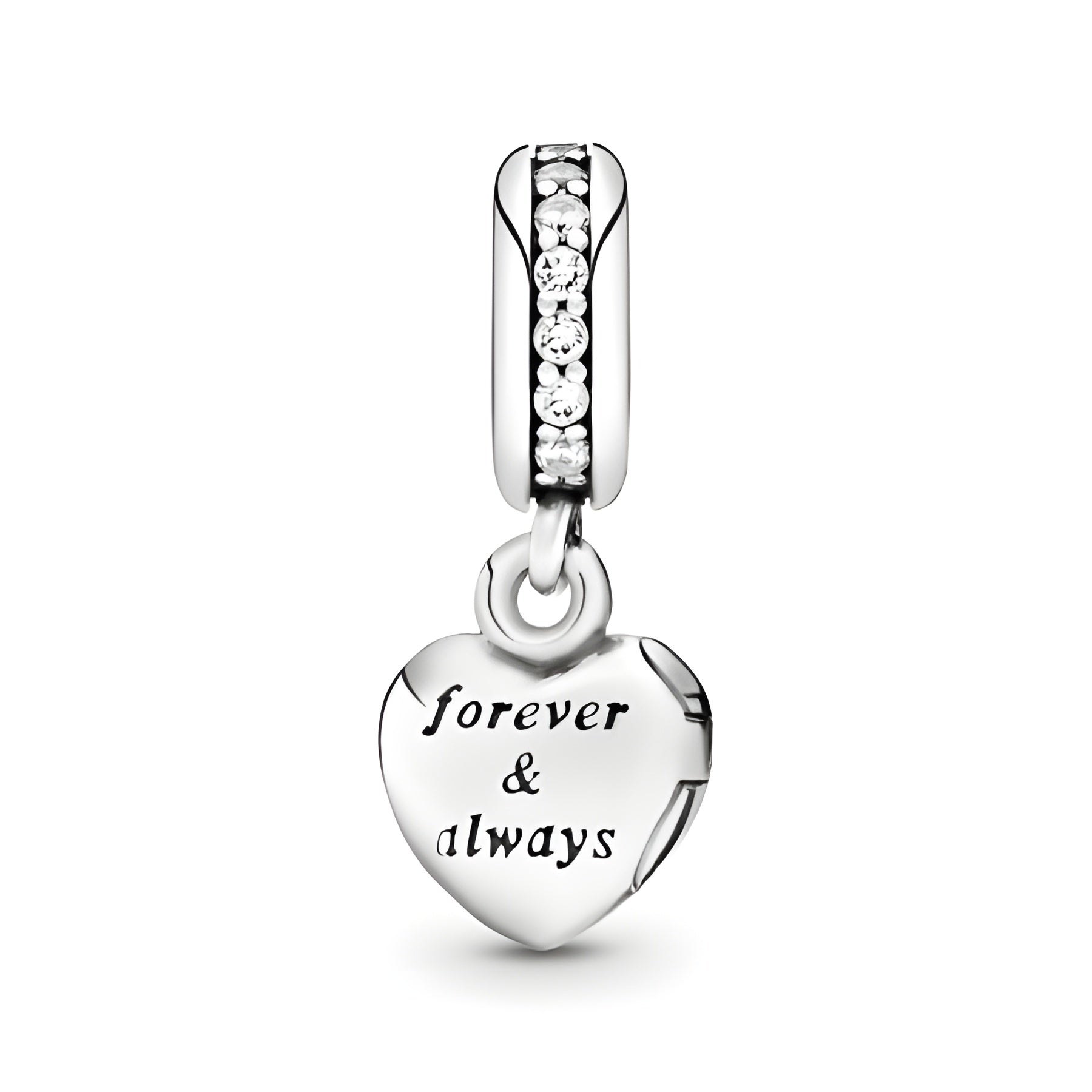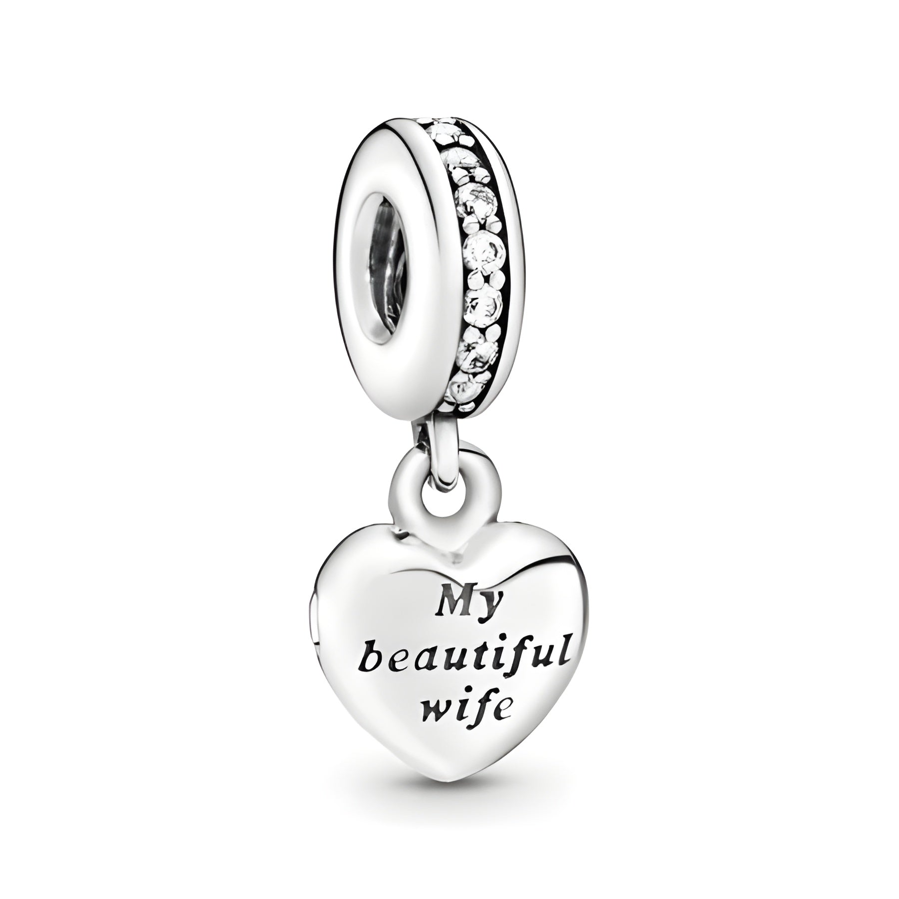 Surprise a wonderful wife with a lasting token of your appreciation with this sterling silver dangle charm for Pandora Moments bracelets. Suspended from a bail accented with cubic zirconia, it's shaped as a heart locket and engraved with "My beautiful wife, forever and always." There won't be a dry eye left in the house.