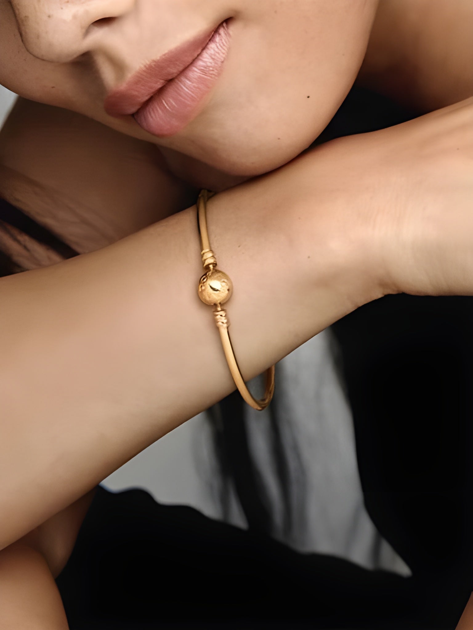 Our signature bangle for Pandora Moments charms is a luxe addition to your everyday jewelry look. The sleek style is expertly crafted from solid 14k gold, hand-finished and buffed to a high shine. It's fitted with our classic logo ball clasp that underpins the minimalist aesthetic. Wear it with or without charms, solo or stacked.