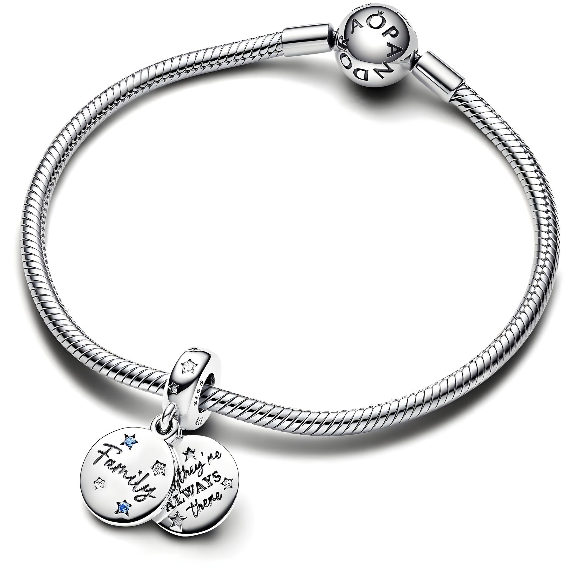 - With the beloved family double charm pendant, you can always carry your loved one with you A sterling silver charm with two pendants that tell a story. The jewellery carries the loving words: "Family... are like STARS, you don't always see them... But they are ALWAYS there" This charm pendant is decorated with clear cubic zirconia in rubbed setting and blue artificial crystals that sparkle like small stars Wear it on your favourite necklace and always remember the people you are closest to you The product comes without bracelet and not in a box. The box and bracelet must be purchased separately. The item is only compatible with items from the Pandora Moments collection