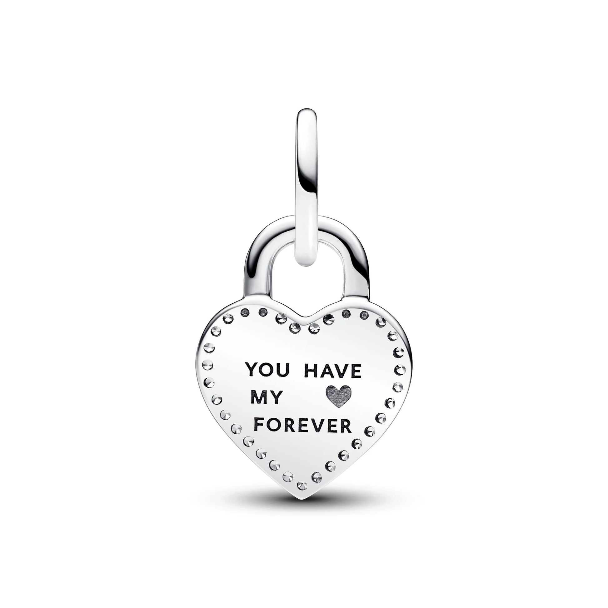 Unlock a secret message of love with the Two-tone Twistable Heart Padlock Double Dangle Charm. This dangle charm features two heart-shaped discs, a 14k rose gold-plated disc with a keyhole cut-out in front of a sterling silver disc with a twistable bar. Turn the bar to "unlock" the two discs and reveal a hidden message on the inside: “TRUE LOVE”. Another engraving on the back of one disc reads: “YOU HAVE MY ? FOREVER.” The two heart-shaped discs are connected by a jump ring, so they cannot be separated. A unique and meaningful charm for the one you love.
